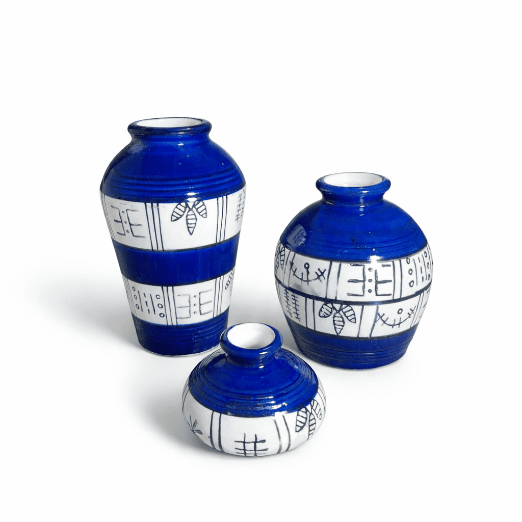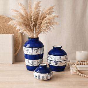 Ceramic Musa Pot Set Of 3 Blue Print (With Thermocol Box)
