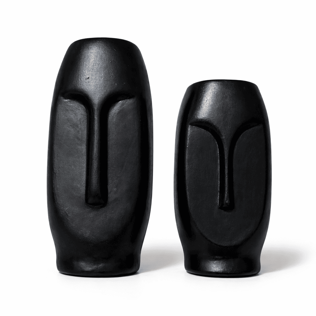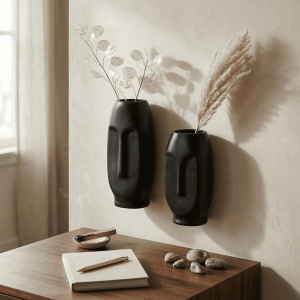 Ceramic Slim Wall Hanging Face Flower Vase Set Of 2 Black (With Thermocol Box)