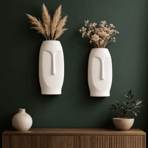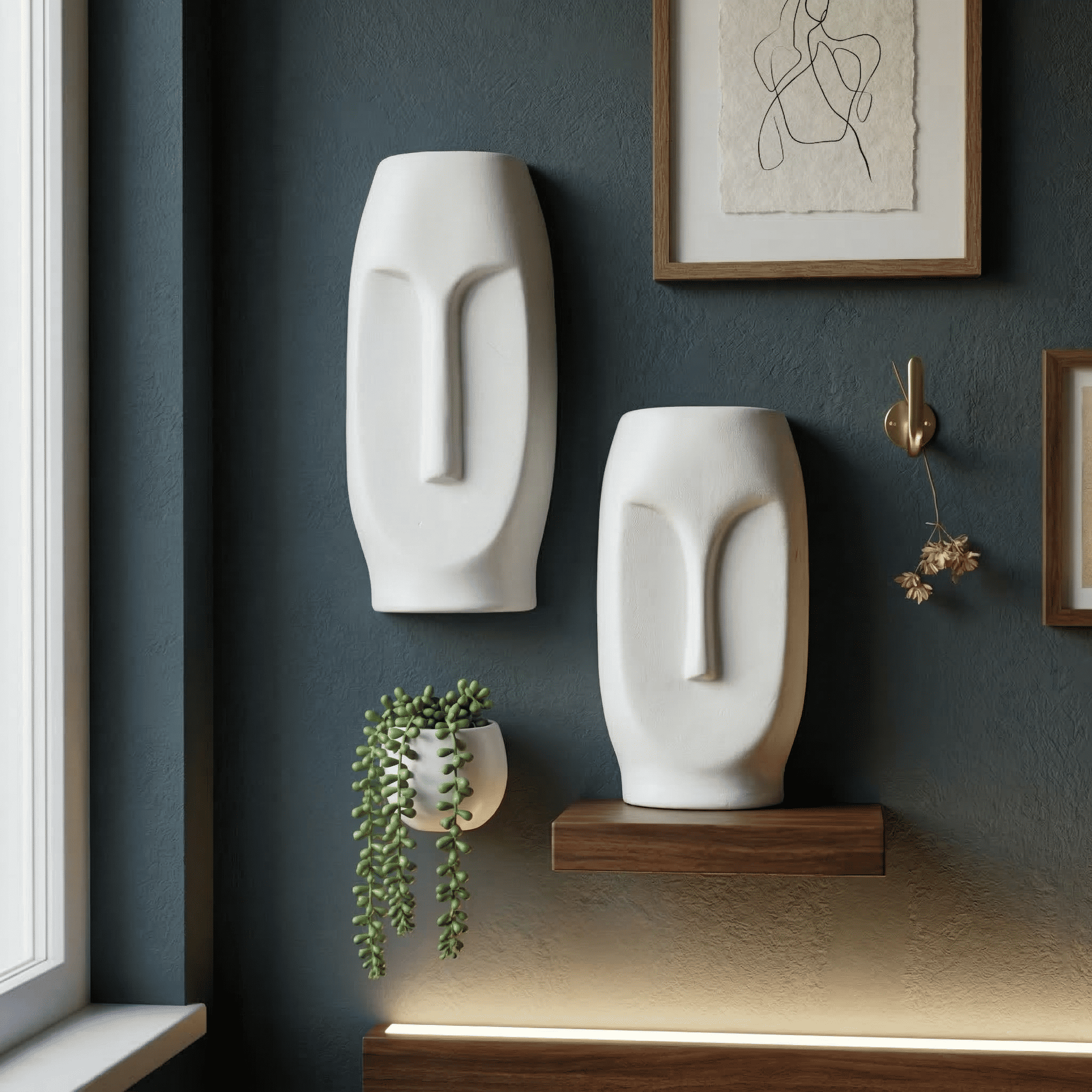 Ceramic Slim Wall Hanging Face Flower Vase Set Of 2 White (With Thermocol Box)
