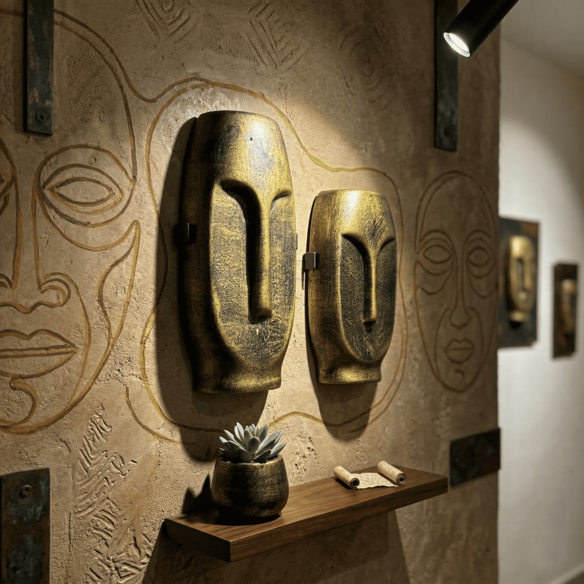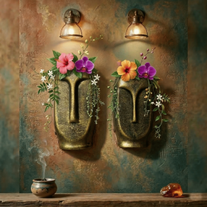Ceramic Slim Wall Hanging Face Flower Vase Set Of 2 Golden Antique (With Thermocol Box)