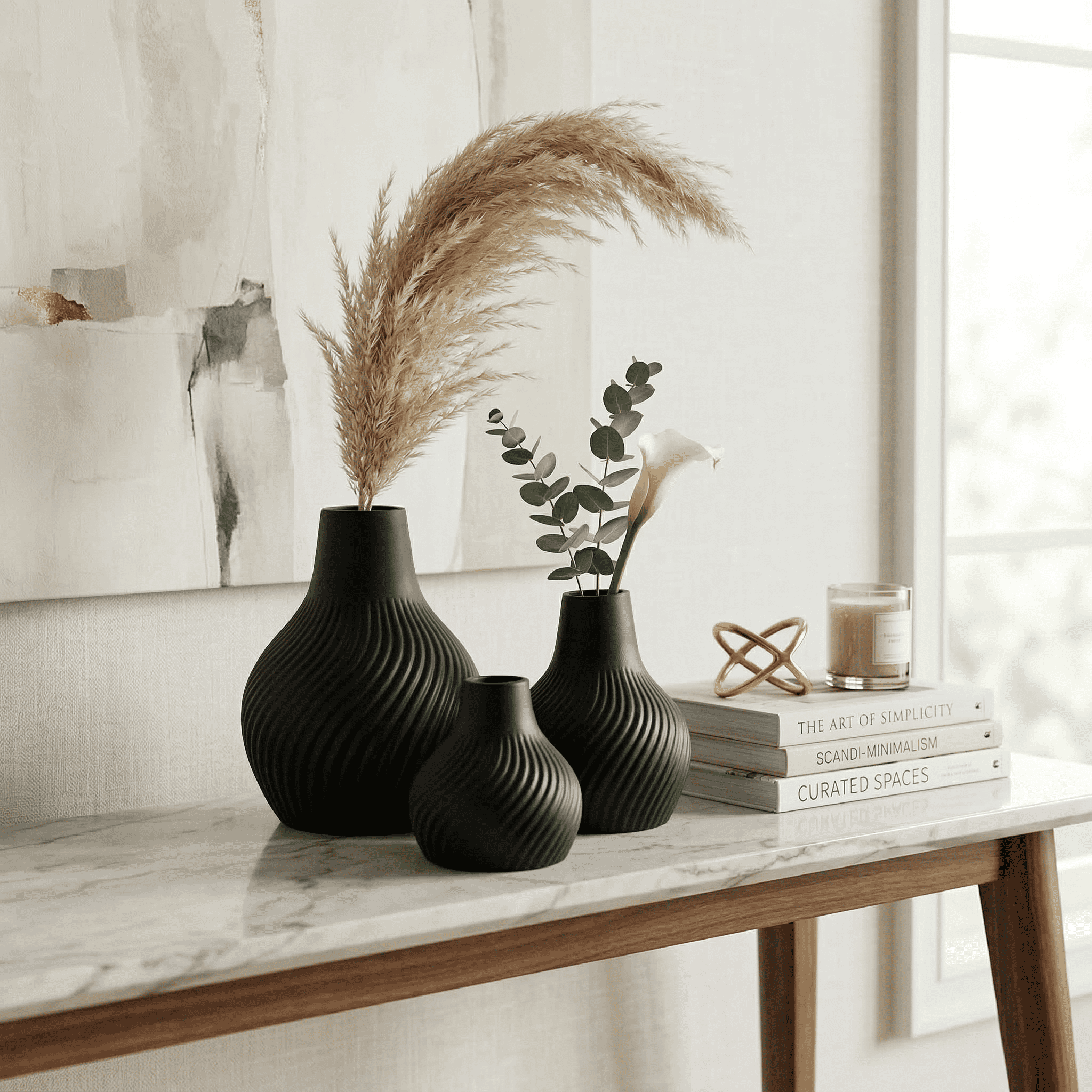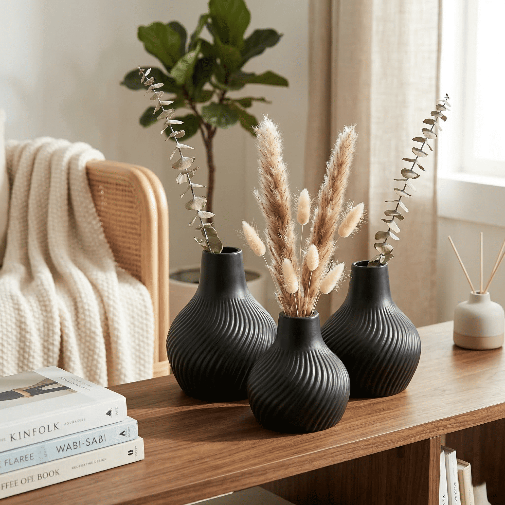 Ceramic Striped Rama Vase Set Of 3 Black In stock 6 × 5 × 8 in 1500 g .